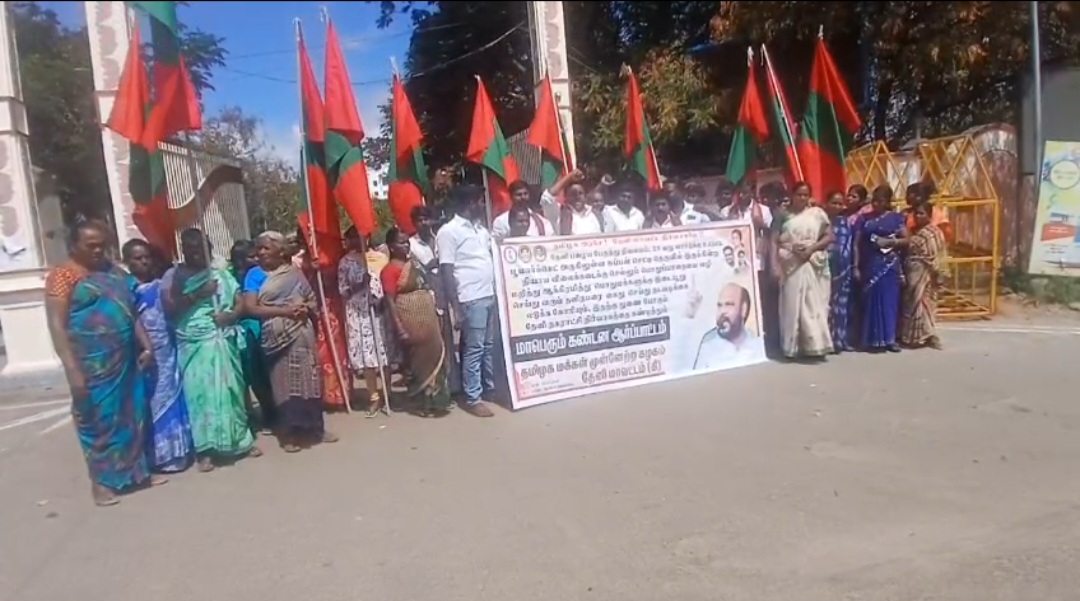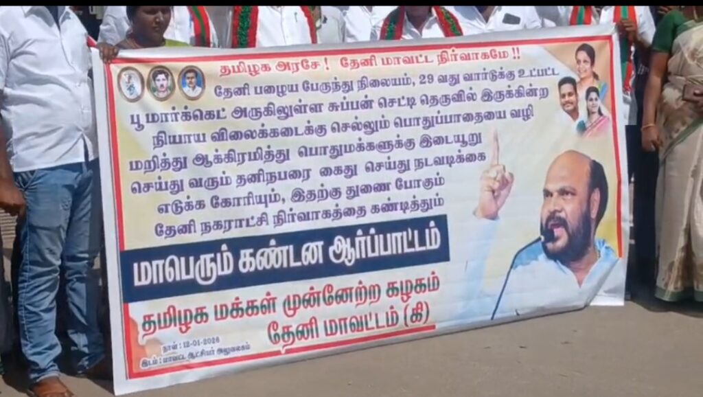 தேனி பழைய பேருந்து நிலையம், 29 வது வார்டுக்கு உட்பட்ட பூமார்க்கெட் அருகிலுள்ள சுப்பன் செட்டி தெருவில் இருக்கின்ற நியாய விலைக்கடைக்கு செல்லும் பொதுப்பாதையை வழி மறித்து ஆக்கிரமித்து பொதுமக்களுக்கு இடையூறு செய்து வரும் தனிநபரை கைது செய்து நடவடிக்கை எடுக்க தேனி மாவட்ட ஆட்சியர் அலுவலகம் முன்பு தமிழக மக்கள் முன்னேற்ற கழக கிழக்கு மாவட்ட செயலாளர் மள்ளர் பாலா தலைமையில் கண்டன ஆர்ப்பாட்டம் நடைபெற்றது.